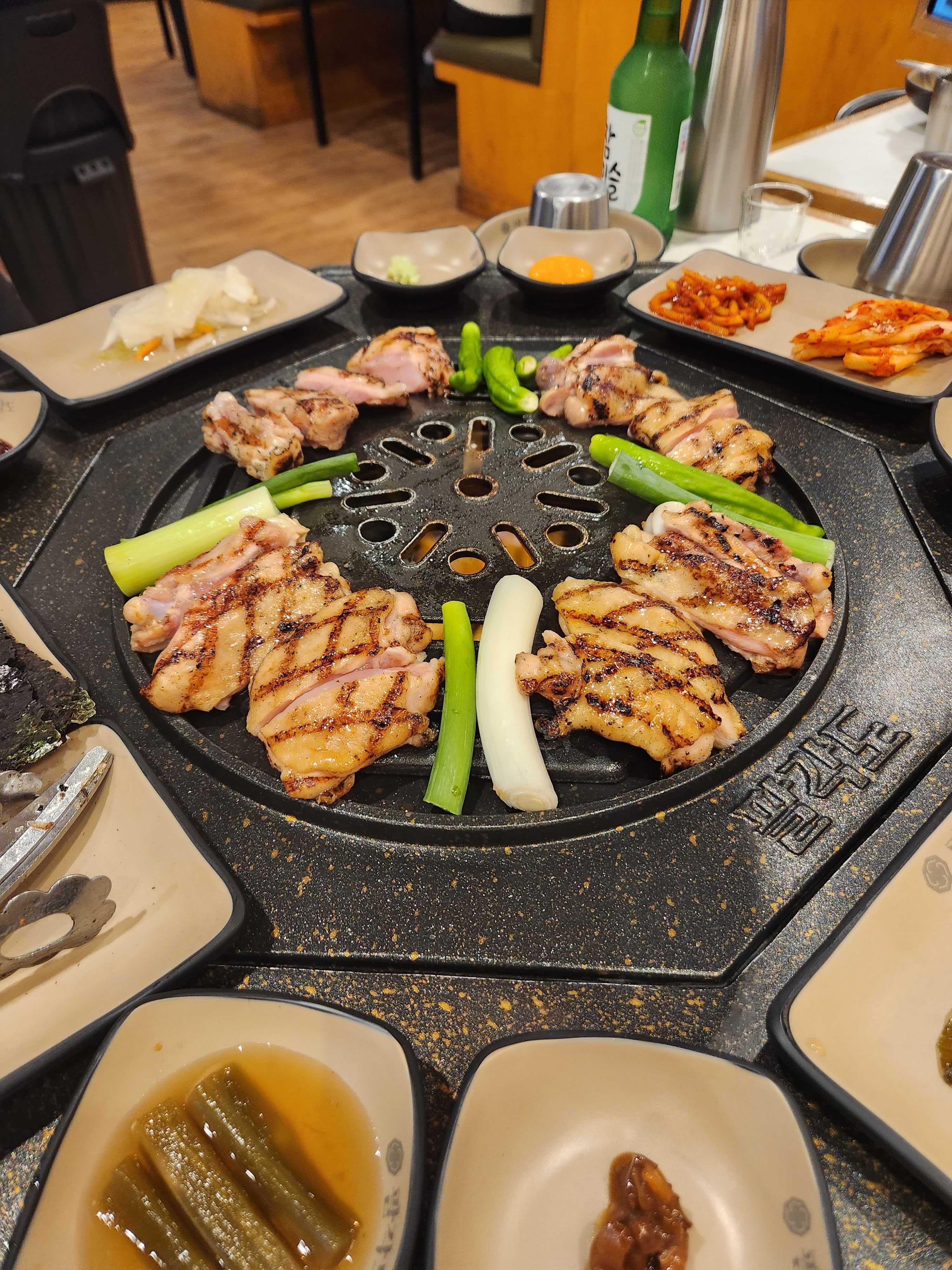 숯불 닭갈비가 나오고 맛있게 익어가고 있는 중이다.
