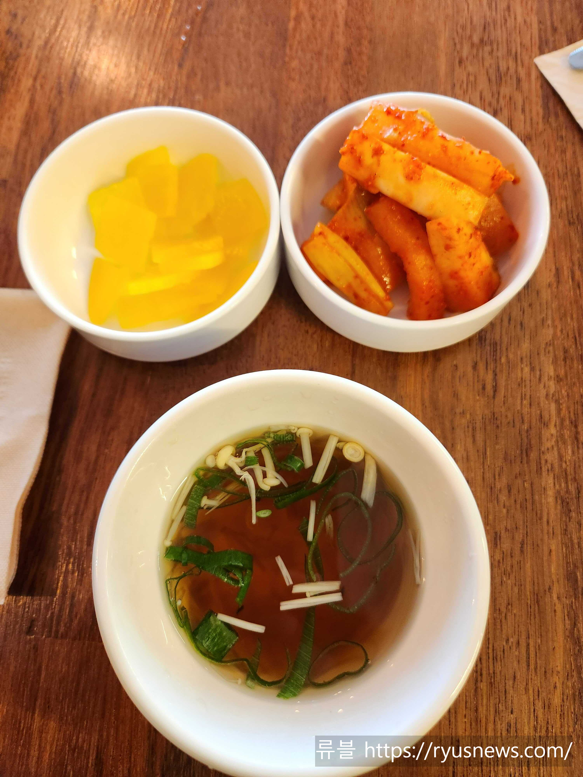 기본 반찬은 깍뚜기와 단무지가 셀프바에서 따로 덜어 먹을 수 있으며,