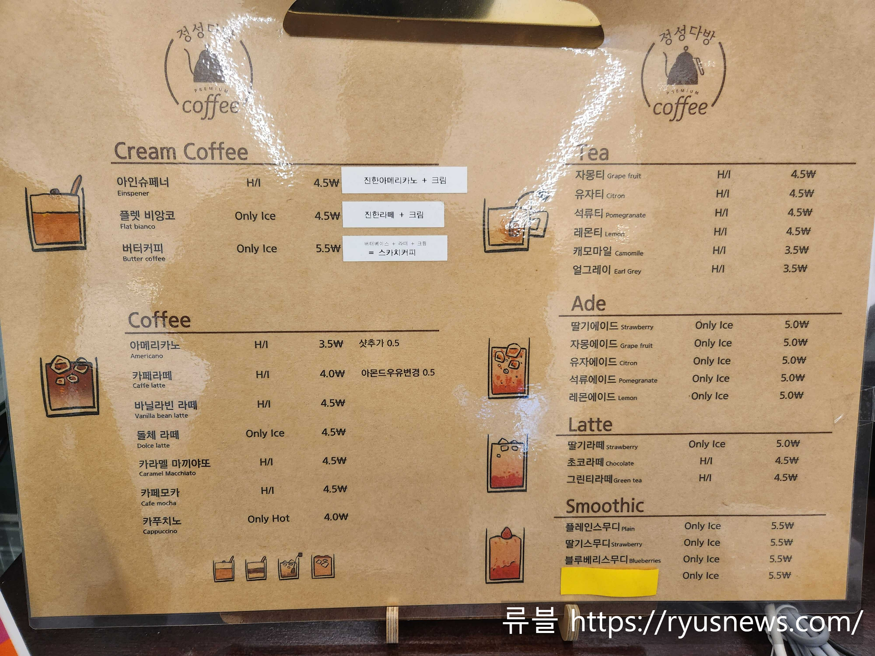 입구 오른쪽에 조명을 받고 있는 정성커피 글씨..
