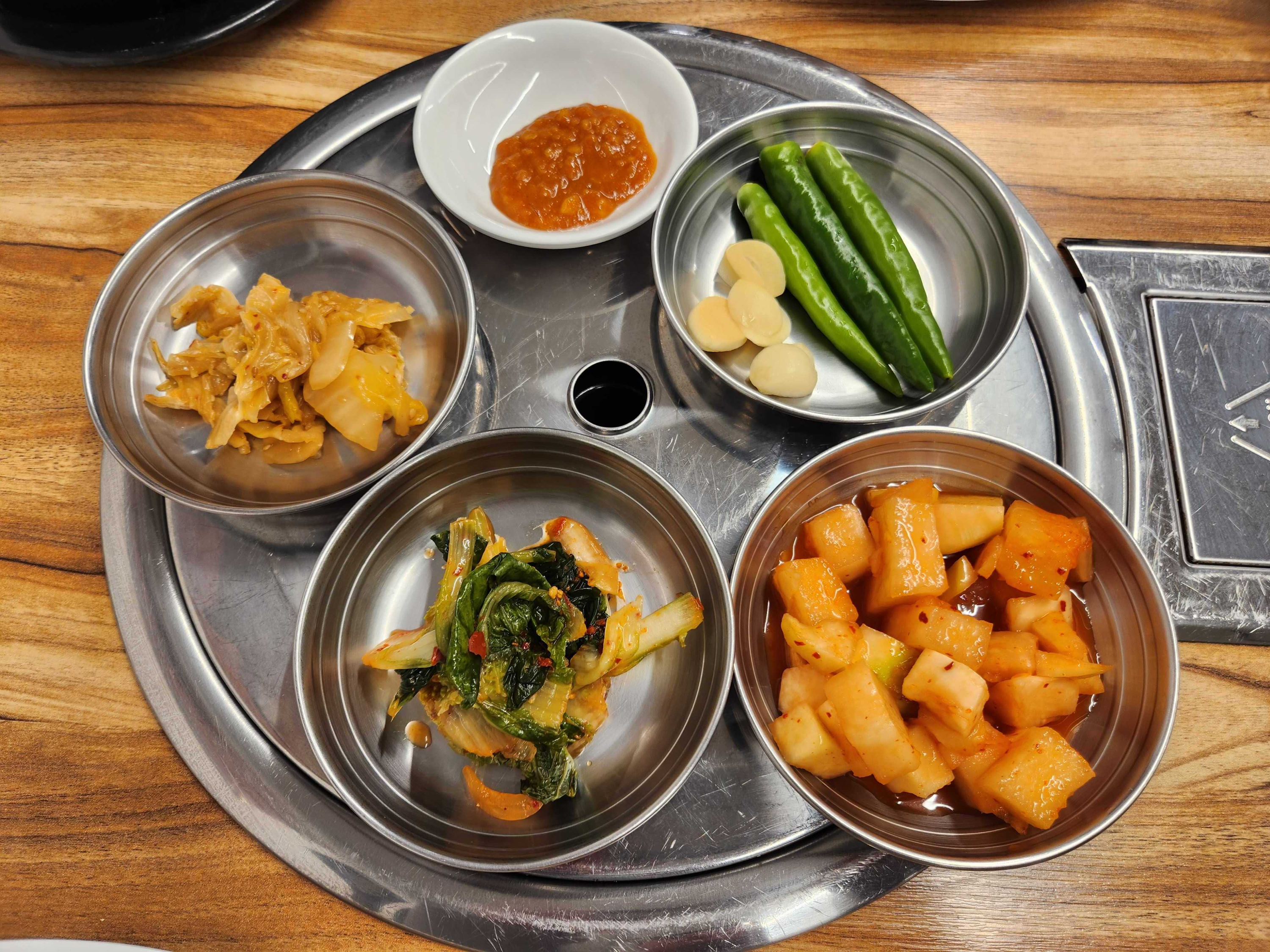 테이블 한켠에 맘껏 덜어먹을 수 있는 김치통이 구비되어 있었고,