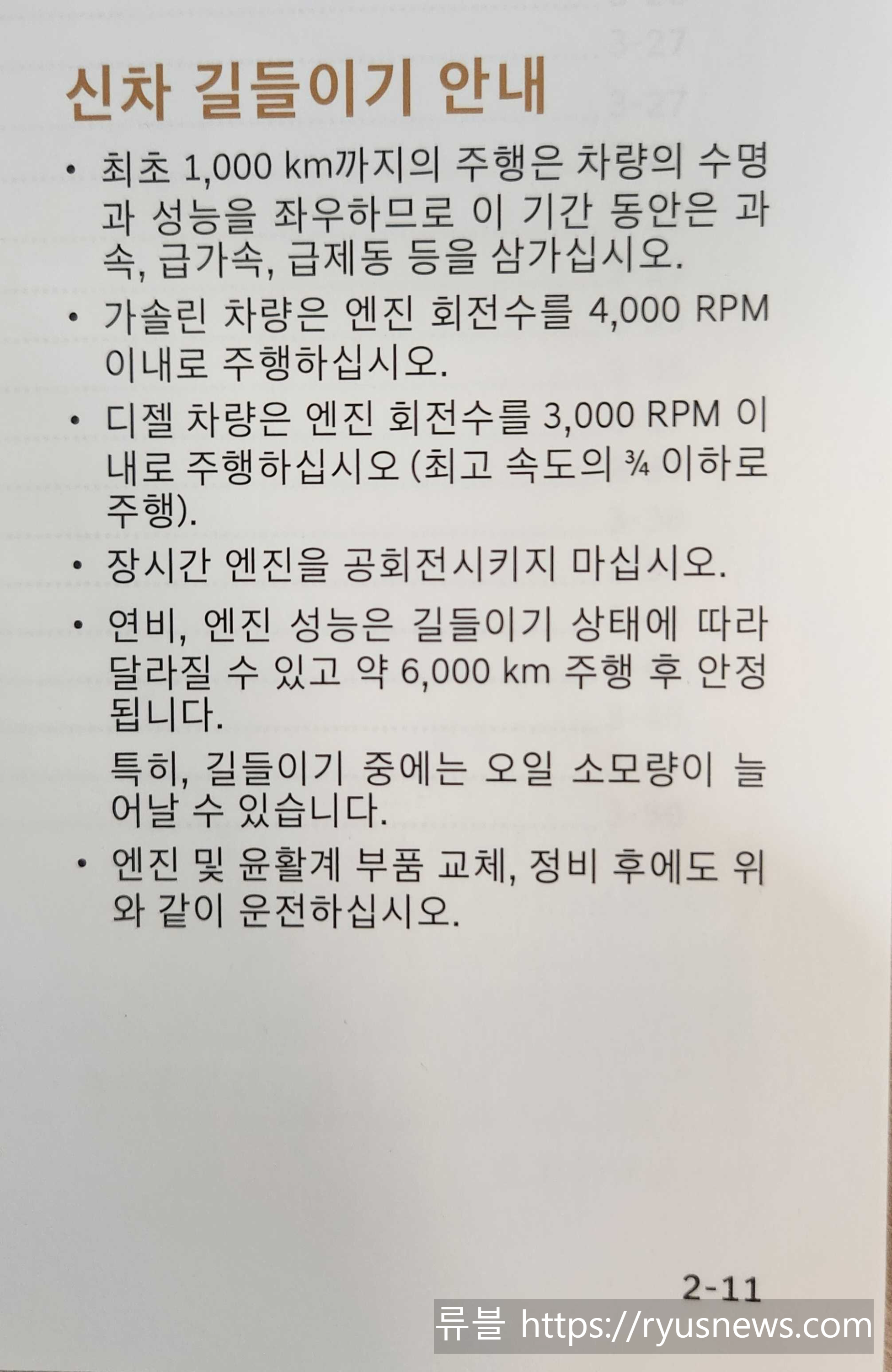 '가솔린 차량은 엔진 회전수를 4,000 RPM 이내로 주행하십시오.'