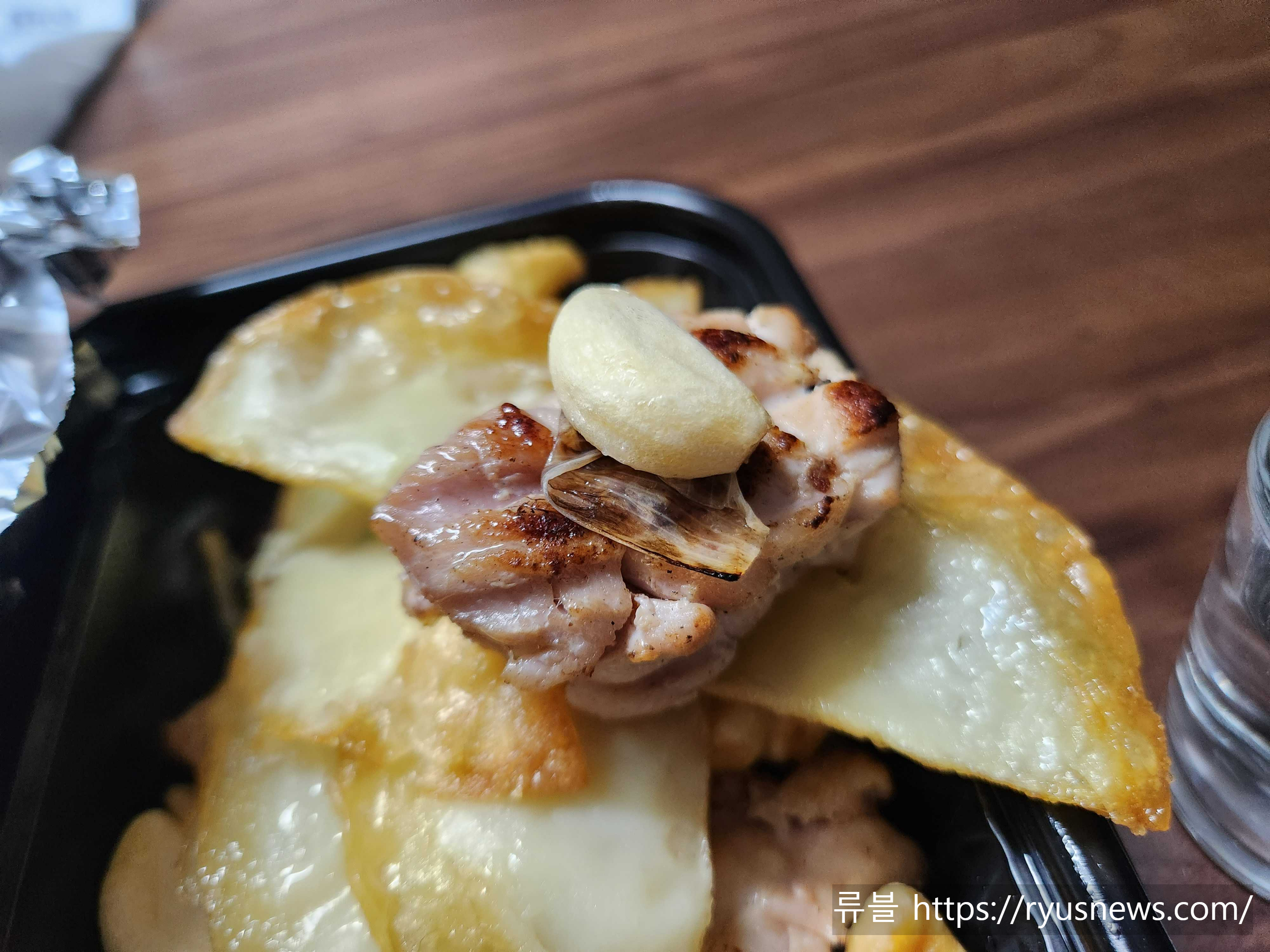사진에 보이는 동그란 떡과 바삭한 구운 마늘, 구운 파가 같이 들어있어,